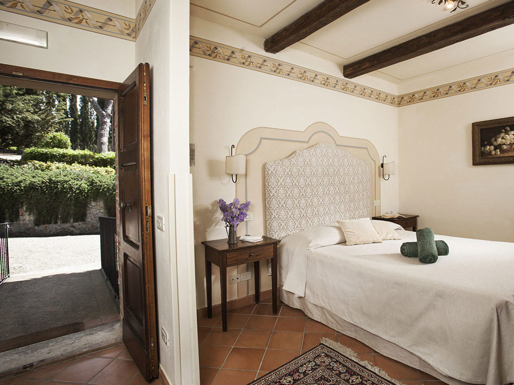 Tutte le accoglienti camere godono di ampie finestre, quelle ubicate nella villa padronale si affacciano sul giardino all’italiana e la meravigliosa piscina in travertino degli anni Trenta, quelle ubicate nelle depandance con ingresso diretto dal giardino hanno vista sulla campagna e le dolci colline.